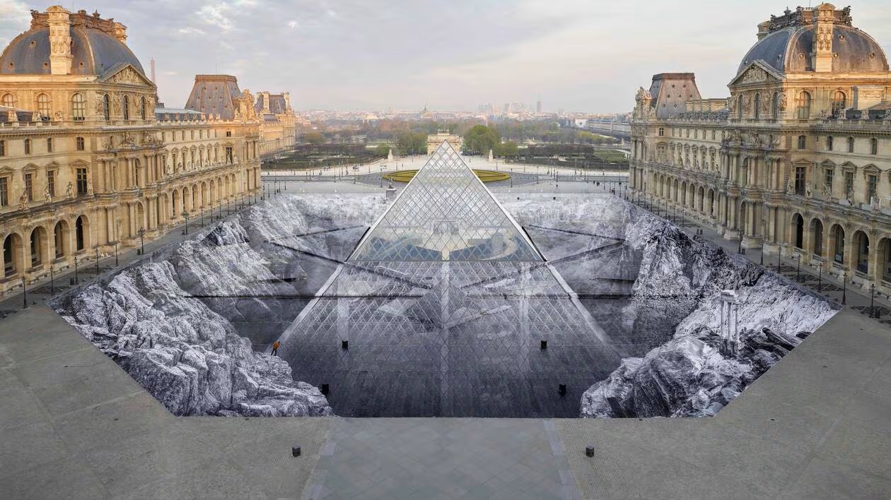1. Cette œuvre nommée « Le Secret de la grande pyramide » est un photomontage mais est considérée comme une gravure. Faite par JR, cette œuvre est un trompe-l’œil, une illusion d’optique. La perspective donne l’impression que le Louvre est plus grand que d’habitude et que le sol a cédé. Elle est disposée au sol autour du Louvre. Cela produit l’effet d’un enfoncement de la pyramide. L’artiste appartient au mouvement du Street Art, c’est-à-dire de l’art de rue, un art éphémère, qui ne dure pas. Chaque pas des visiteurs décolle un bout de papier, fragile. Du 26 au 31 mars 2019, l’oeuvre a été protégée pour que tout le monde y ait accès puis ensuite a été laissée à l’abandon.